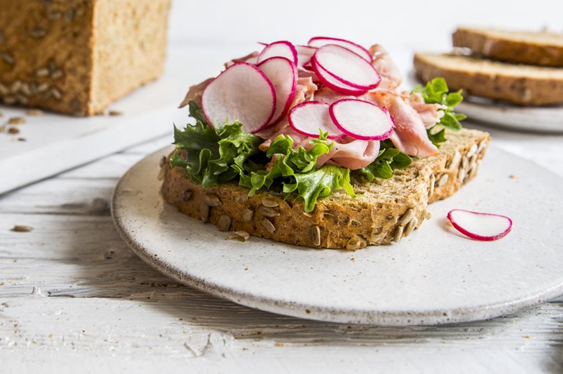 Speltbrød med løvtynn skinke og reddik