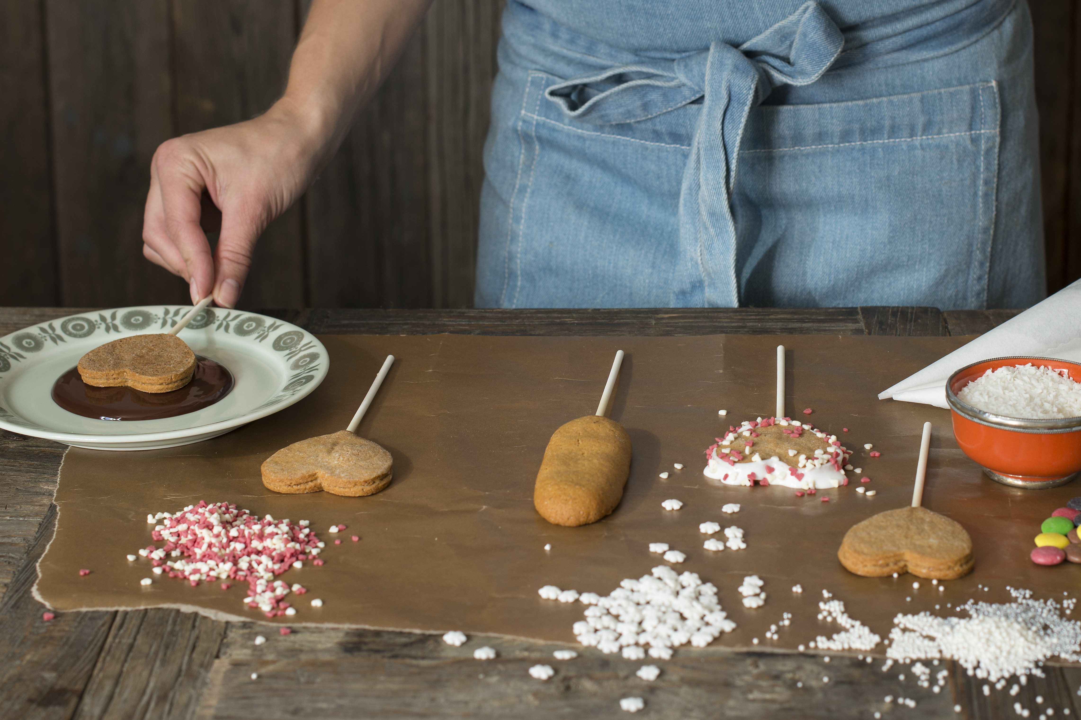 - Stikk ut hjerter av pepperkakedeig, legg to og to sammen med en pinne imellom før steking.