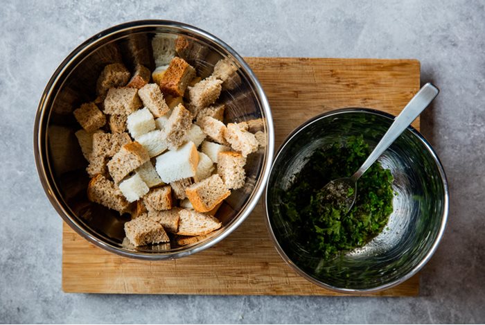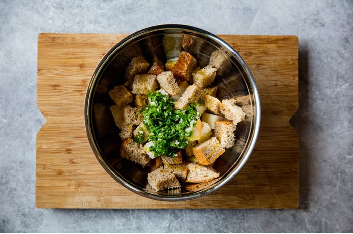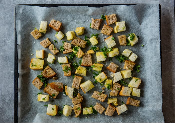 - Sett oven på 200 grader. Skjær brødet i terninger. Bland sammen olje, salt, hvitløk og urter i en bolle.