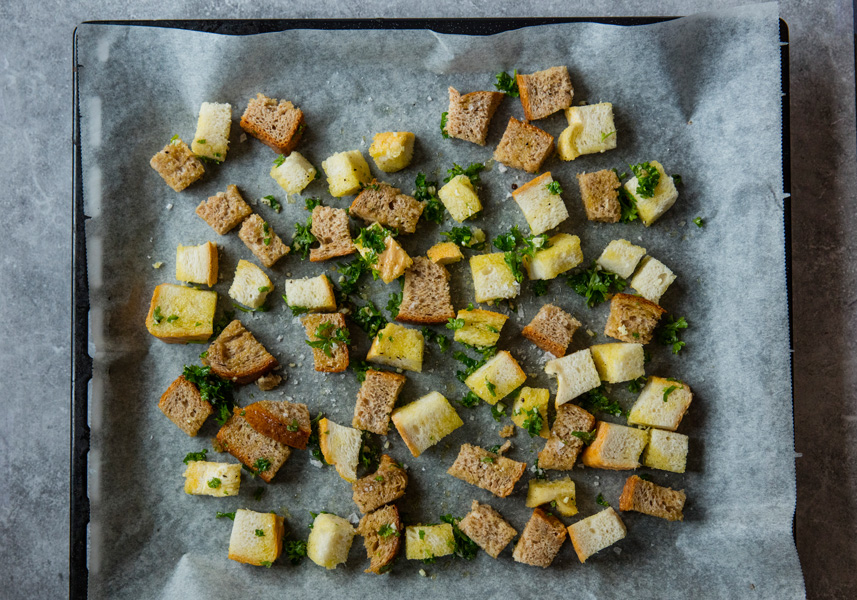 Stek i 10 minutter. Vend krutongene et par ganger underveis til de er gylne og fine.