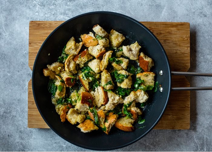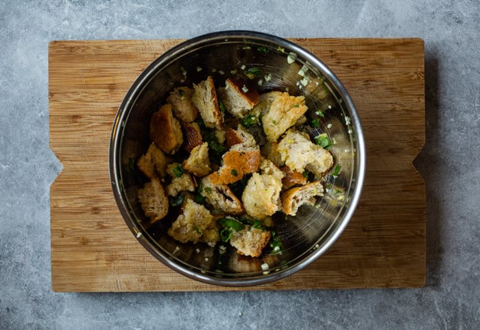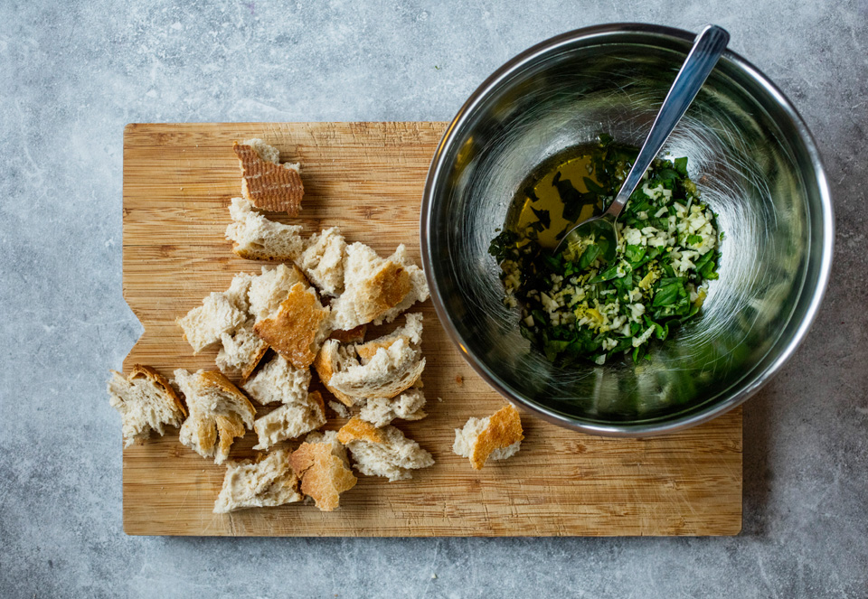 - Riv brødet i store biter. Finhakk hvitløk og basilikum og riv sitronskallet før du presser sitronen.